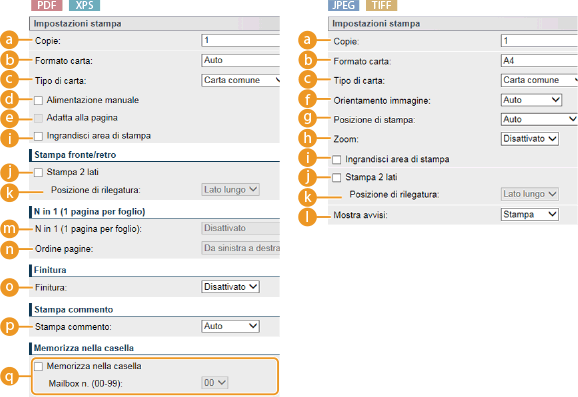 Icone* nella descrizione*Le icone vengono omesse per le impostazioni che vengono visualizzate indipendentemente dal formato del file. |
