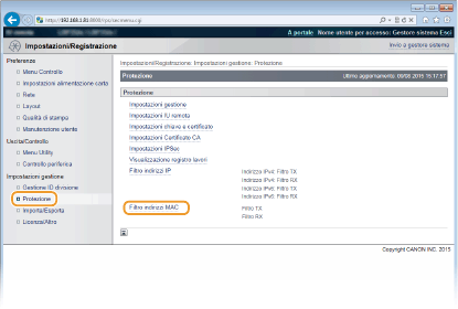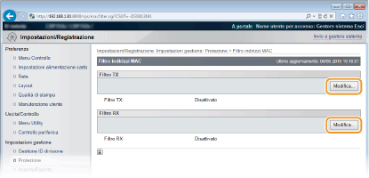 Non è necessario delimitare gli indirizzi con trattini o due punti. Verificare errori immissione Se gli indirizzi MAC sono immessi in modo non corretto, potrebbe non essere possibile accedere alla macchina dalla IU remota, in questo caso è necessario impostare <Filtro indirizzi> a <Disattivato>. Filtro indirizziDopo aver selezionato [Rifiutare] in [Criterio predefinito] I pacchetti in uscita multicast e broadcast non possono essere filtrati. Eliminazione di un indirizzo MAC dalle eccezioni Selezionare un indirizzo MAC e fare clic su [Cancella]. |