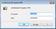 Accesso alla macchinaQuando si cerca di stampare da un computer con Gestione ID reparto abilitato, viene visualizzata la seguente schermata a comparsa (a meno che la casella di controllo [Confermare ID reparto/PIN durante la stampa] non sia deselezionata): | | |