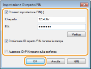 2 | Se necessario, modificare le impostazioni e fare clic su [OK]. [Consenti impostazione PIN] Selezionare la casella di controllo per abilitare l'impostazione PIN. [ID reparto] Digitare il numero di ID reparto. [PIN] Immettere il PIN corrispondente all'ID reparto, come necessario. [Verifica] Fare clic per verificare che siano stati immessi i corretti ID e PIN. Questa funzione non è disponibile se macchina e computer sono collegati tramite porta USB o WSD (Web Services on Devices). [Confermare ID reparto/PIN durante la stampa] Selezionare la casella di controllo per visualizzare la finestra a comparsa [Confermare ID reparto/PIN] ogni volta che si stampa dal computer. [Autentica ID/PIN reparto sulla periferica] Selezionare la casella di controllo se la macchina e il computer sono collegati tramite porta USB o WSD. |