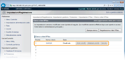 Abilitazione della comunicazione IPSec). Un criterio di protezione è costituito dai gruppi di impostazioni descritti di seguito. È possibile registrare più criteri in base a una combinazione di indirizzo IP e numero di porta. Dopo la registrazione dei criteri, specificare l'ordine con cui devono essere applicati.