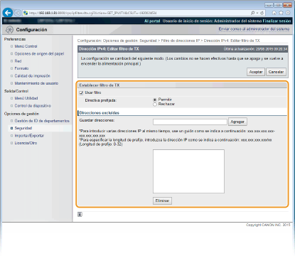 2 | Especifique las direcciones excluidas. Introduzca la dirección IP (o el rango de direcciones IP) en [Guardar direcciones] y haga clic en [Agregar]. Comprobación de los errores de entrada Si las direcciones IP se introducen de forma incorrecta, es posible que no pueda acceder al equipo desde la IU remota, en cuyo caso deberá establecer <Filtro de direcci.> en <Desactivado>. Filtro de direcci.Cuando haya seleccionado [Rechazar] en [Directiva prefijada] Los paquetes de bucle invertido, difusión y multidifusión no pueden filtrarse. Eliminación de una dirección IP de las excepciones Seleccione una dirección IP y haga clic en [Eliminar]. |