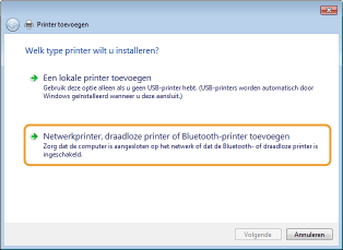 Als u Windows 7/Server 2008 gebruikt, klikt u op [Netwerkprinter, draadloze printer of Bluetooth-printer toevoegen].