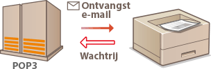 Met behulp van E-Mail Print kunt u de melding en bijgevoegde beeldbestanden van een e-mail die is ontvangen van de POP3 mailserver afdrukken zonder tussenkomst van een computer. E-mails kunnen handmatig worden ontvangen maar ook automatisch in regelmatige intervallen worden ontvangen. Als het SMTP protocol wordt gebruikt, worden e-mails die zonder mailserver rechtstreeks naar het apparaat zijn verzonden, afgedrukt.
