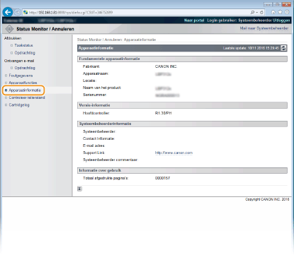 [Beheerinstellingen] op de pagina [Instellingen/registratie] (Het wachtwoord van de systeembeheerder instellen).
