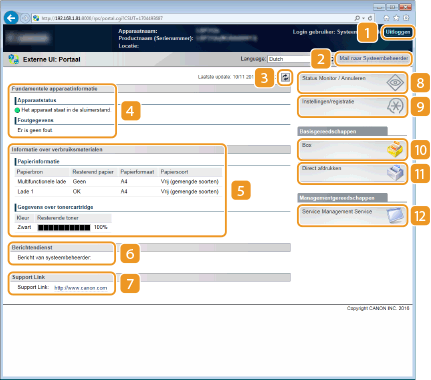 Geeft een bericht van de systeembeheerder weer, zoals opgegeven bij [Berichtendienst/Support Link] in [Instellingen/registratie]