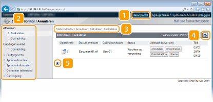 Geeft de pagina [Status Monitor/Annuleren] weer. U kunt deze pagina gebruiken om de huidige afdrukstatus te controleren, het afdrukken te annuleren en de geschiedenis van afdruktaken te bekijken.