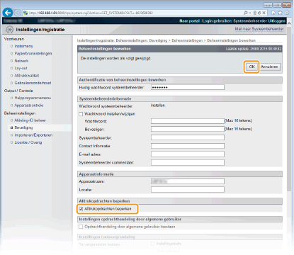 Ook als de afdrukbewerkingen zijn beperkt, kunnen instellingslijsten en -rapporten worden afgedrukt. Rapporten en lijsten afdrukken |