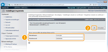 Klik op [Instellingen sleutel en certificaat] voor het installeren van een sleutelpaar, of [Instellingen CA-certificaat] voor het installeren van een CA-certificaat.