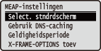 ![]() | De instel-items voor het hoofdscherm over MEAP worden in een lijst geplaatst en kort toegelicht. Standaardinstellingen worden aangegeven met een dolksymbool ( ). |