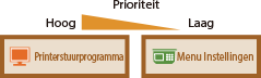 Prioriteit van instellingenInstellingen die worden opgegeven in het printerstuurprogramma hebben voorrang boven de instellingen op het bedieningspaneel. | | Als u USB Direct Print of Direct Print verricht, hebben de instellingen die zijn opgegeven voor het afdrukken of zijn opgeslagen in TIFF-gegevens voorrang boven de instellingen op het bedieningspaneel. | |