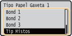 Se troca frequentemente de tamanhos de papel, pode especificar <Tip Mistos>, que lhe poupa o trabalho de alterar a definição do tamanho de papel de cada vez que imprimir. No entanto, tenha em atenção que esta definição permite que a máquina imprima mesmo que a definição de tipo de papel no controlador de impressora não corresponda ao tipo de papel que está efetivamente colocado na máquina.