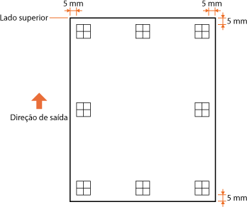 são impressas. Determine a direção e distância para o ajuste com base nessas marcas. Quando a posição de impressão está normal, todas as marcas são impressas numa posição de impressão de 5 mm da extremidade mais próxima do papel.
