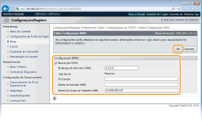 Um nome de grupo de trabalho definido em [Nome do Grupo de Trabalho] em [Configurações de SMB] é usado automaticamente para [Nome do Grupo de Trabalho SMB], se aplicável. Uma alteração ao nome do grupo de trabalho em [Nome do Grupo de Trabalho SMB] também é aplicada a [Nome do Grupo de Trabalho] em [Configurações de SMB].