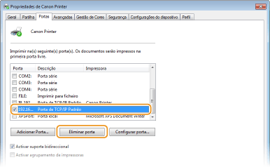 Não pode eliminar uma porta presentemente configurada como porta da impressora. Para eliminar esta porta, selecione uma porta diferente e clique em [Aplicar] para a configurar como nova porta da impressora e depois elimine a porta original.