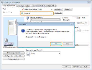 Selecione [Armazenar] em [Método de saída] e clique em [Sim].