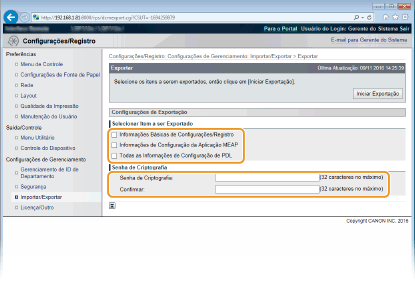 Para exportar os dados de definições de itens que podem ser definidos a partir de [Configurações/Registro] na Página do portal, marque as caixas correspondentes.