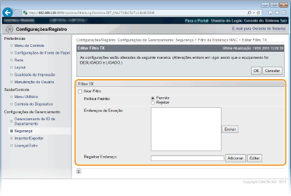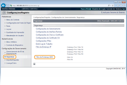 Se os endereços MAC não forem introduzidos corretamente, pode não conseguir aceder à máquina a partir da Interface Remota; nesse caso, será necessário definir <Filtro de Endereço> para <Desativado>. Filtro de Endereço