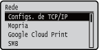 Se <Rede> não for apresentadoSe <Rede> em <Seleção de Interface> estiver definido para <Desativado>, <Rede> não é apresentado no menu Configuração. Seleção de Interface