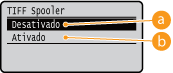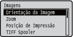 Todas as definições relativas a ficheiros de imagem (ficheiros JPEG e TIFF) disponíveis para Impressão direta por USB, Impressão direta e Impressão de correio eletrónico estão listadas com descrições curtas. As predefinições estão assinaladas com uma cruz (