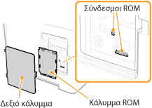 Η ενότητα αυτή περιγράφει τον τρόπο εγκατάστασης του Κιτ Εκτύπωσης Γραμμωτών Κωδικών ή του Ρύθμιση διεθνούς γραμματοσειράς PCL στη συσκευή. Η ROM χρησιμοποιείται συνδεδεμένη στους συνδέσμους ROM μέσα από το δεξί κάλυμμα της συσκευής. Διαβάστε τις προφυλάξεις στην ενότητα Εγκατάσταση προτού συνδέσετε τη ROM.