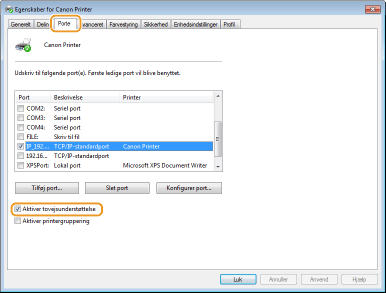 På fanen [Porte] skal du kontrollere, at afkrydsningsfeltet [Aktiver tovejsunderstøttelse] er valgt.