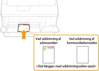 Ilæg postkortet med udskrivningssiden opad og med den korte kant mod maskinen, hvis postkorttypen er almindelig eller 4-på-1, eller hvis den lange kant er mod maskinen, hvis det drejer sig om svarpostkort.