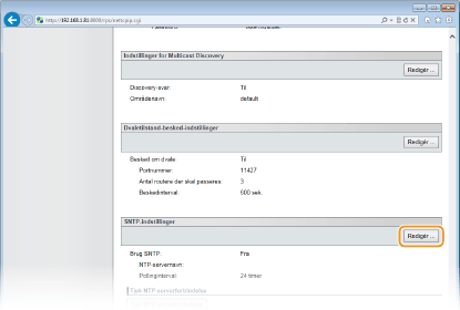 Maskinens SNTP understøtter både NTP- (version 3) og SNTP-servere (version 3 og 4). |