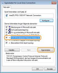 Marker afkrydsningsfeltet [TCP/IPv4 (Internet Protocol Version 4)] eller [Internetprotokoller], og klik på [Egenskaber].