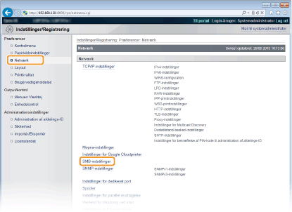 Brug af kontrolpaneletDu kan også aktivere eller deaktivere SMB-serveren fra indstillingsmenuen på kontrolpanelet. SMBDu kan også aktivere eller deaktivere SMP-udskrivning fra indstillingsmenuen på kontrolpanelet. SMB |