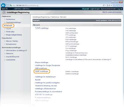 Med SNMP kan printeradministrationsoplysningerne, f.eks. udskrivningsprotokoller og printerporte, overvåges og hentes regelmæssigt fra en computer på netværket.