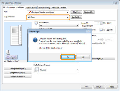 Vælg [Gem] i [Outputmetode], og klik på [Ja].