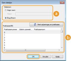 [Postkasser]Et sted, hvor du kan gemme udskriftsdata på SD-kortet, kaldes en boks. Vælg nummeret for den boks, hvor dokumentet skal gemmes. Du kan tildele et navn til boksen, så den er lettere at identificere.