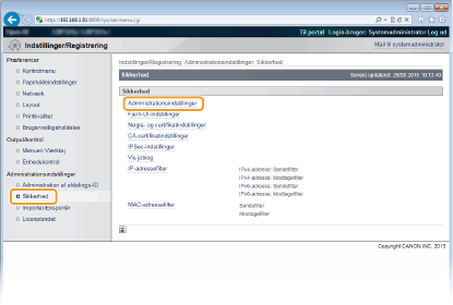 Klik på [Sikkerhed]  [Administrationsindstillinger].