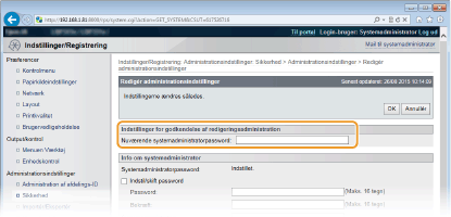 Indtast systemadministratoradgangskoden i [Nuværende systemadministratorpassword].