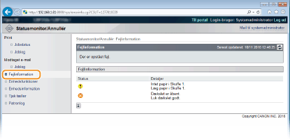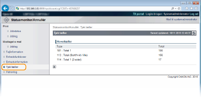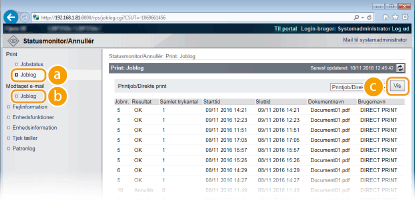 Status for alle udskrivningsjob vises uanset indstillingerne for administration af afdelings-id. Standardindstillingerne forhindrer visse handlinger, som f.eks. at slette et dokument i at blive udskrevet eller forstyrre et udskrivningsjob, i at blive udført i tilstande som generel bruger. Hvis du ønsker at anvende dokumenter i tilstand som generel bruger, skal du logge på i administratortilstand og aktivere [Tillad generel brugers jobhandling]. Gøre slutbrugerne i stand til at bruge dokumenterne Hvis du indtastede dit brugernavn, da du loggede på som almindelig bruger, vises dit brugernavn kun på de dokumenter, som du udskrev. Klik på [Jobnr.] på de midlertidigt afbrudte dokumenter, og sikr dokumenter for at vise detaljerede oplysninger. Du kan kontrollere brugernavnet og sideoptællingen for det udskrevne dokument. |