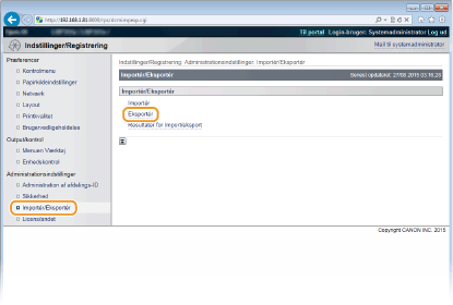 Du kan eksportere data om maskinindstillinger og gemme dem på en computer. Det anbefales, at du sikkerhedskopierer vigtige indstillinger med jævne mellemrum.