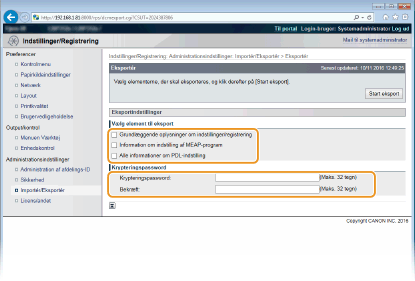 For at eksportere indstillingsdata for elementer, der kan indstilles fra [Indstillinger/Registrering] på portalsiden, skal du vælge afkrydsningsfelterne for elementerne.