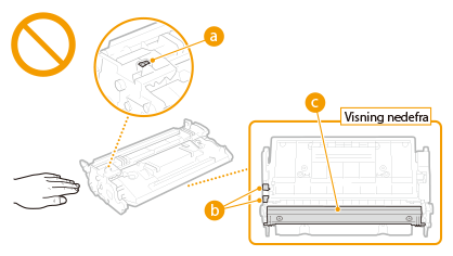 Håndtering af tonerpatronenSørg for at holde tonerpatronen vha. håndtaget. ![]() Rør ikke ved tonerpatronhukommelsen ( ) eller de elektriske kontakter ( ). For at undgå at ridse overfladen på tromlen inde i maskinen eller eksponere den til lys må du ikke åbne valsens beskyttelsesdæksel ( ).![]() Tag ikke tonerpatronen ud af emballagen eller denne maskine, bortset fra når det er nødvendigt. Tonerpatronen er et magnetisk produkt. Lad den ikke komme i nærheden af produkter, der er følsomme over for magnetisme, herunder disketter og diskdrev. Dette kan føre til tab af data. Opbevaring af tonerpatronenSørg for, at opbevaringen sker i det følgende miljø, så der bliver en sikker og tilfredsstillende brug. Temperaturområde for opbevaring: 0 °C til 35 °C Luftfugtighedsområde for opbevaring: 35 til 85 % relativ luftfugtighed (ingen kondens)* Undlad at åbne tonerpatronen før brug. Når du fjerner tonerpatronen fra denne maskine med henblik på opbevaring, skal du placere den fjernede tonerpatron i den originale emballage. Under opbevaring af tonerpatronen skal du sørge for, den ikke står lodret eller er vendt på hovedet. Toneren kan sætte sig fast og vil muligvis ikke kunne vende tilbage til dens oprindelige tilstand, selvom den bliver rystet. * Selv inden for luftfugtighedsområdet for opbevaring, kan der dannes vanddråber (kondens) inden i tonerpatronen, hvis der er forskel på temperaturen inden i og uden for tonerpatronen. Kondensering vil påvirke udskriftskvaliteten af tonerpatronen negativt. Opbevar ikke tonerpatronen på følgende stederSteder, hvor der er åben ild Steder, hvor der er direkte sollys eller kraftigt sollys i fem minutter eller mere Sted, hvor luften er meget saltholdig Steder, hvor der er korroderende gasser (dvs. aerosolspray og ammoniak) Steder med høj temperatur og høj luftfugtighed Steder, hvor der er markante ændringer i temperaturen og luftfugtigheden, så der nemt kan opstå kondens Steder, hvor der er meget støvet Steder, der er inden for børns rækkevidde Pas på med forfalskede tonerpatronerVær opmærksom på, at der er forfalskede Canon-tonerpatroner i omløb. Brug af forfalskede tonerpatroner kan resultere i dårlig printkvalitet eller maskinproblemer. Canon er ikke ansvarlig for fejlfunktioner, ulykker eller skader, der opstår ved brug af forfalskede tonerpatroner. For flere informationer, se global.canon/ctc. Tilgængelighedsperiode for reservedele og tonerpatroner og lignendeReservedele og tonerpatroner og lignende til maskinen fås i mindst syv (7) år efter, produktion af denne maskinmodel er ophørt. Emballage til tonerpatronerGem emballagen til tonerpatronen. Den er nødvendig under transport af maskinen. Emballagen kan ændres i form eller anbringelse eller kan tilføjes eller fjernes uden varsel. Når du har trukket forseglingstapen ud af tonerpatronen, skal du bortskaffe den i henhold til gældende, lokale bestemmelser. Ved bortskaffelse af brugt tonerpatron eller lignendeVed bortskaffelse af en tonerpatron eller lignende skal du placere den i den originale emballage for at forhindre spredning af toner inde fra og bortskaffe den i henhold til gældende, lokale bestemmelser. |