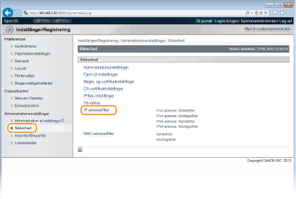 Brug af kontrolpaneletDu kan også aktivere eller deaktivere IP-adressefiltrering fra indstillingsmenuen på kontrolpanelet. Adressefilter |