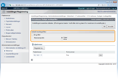 4 | Markér afkrydsningsfeltet [Brug filter], og klik på [Afvis] eller alternativknappen [Tillad] for [Standardpolitik]. [Brug filter] Markér afkrydsningsfeltet for at begrænse kommunikation. Ryd afkrydsningsfeltet for at deaktivere begrænsningen. [Standardpolitik] Vælg betingelsen for at tillade eller afvise andre enheders kommunikation med maskinen. [Tillad] | Vælg for at blokere kommunikationspakker, når de sendes til eller modtages fra enheder, hvis IP-adresser er indtastet i [Fejladresser]. Kommunikation med andre enheder er tilladt. | [Afvis] | Vælg for kun at godkende kommunikationspakker, når de sendes til eller modtages fra enheder, hvis IP-adresser er indtastet i [Fejladresser]. Kommunikation med andre enheder er ikke tilladt. |