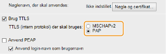 1 | Marker afkrydsningsfeltet [Brug TTLS] eller [Anvend PEAP]. Intern protokol for TTLS Du kan vælge MSCHAPv2 eller PAP. Hvis du vil bruge PAP, skal du klikke på alternativknappen [PAP]. |