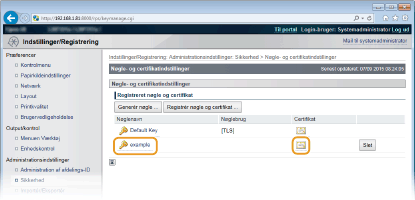 Klik på [Nøglenavn] eller [Certifikat] for det certifikat, der skal registreres.
