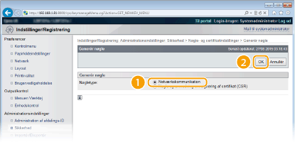 Der kan genereres et nøglepar med maskinen, når det er nødvendigt til krypteret kommunikation via TLS (Transport Layer Security). Du kan bruge TLS, når du får adgang til maskinen via Fjern-UI eller udfører IPP-udskrivning. Der kan registreres op til otte nøglepar, inklusive dem der er indstillet på forhånd. Selvsignerede certifikater bruges med nøglepar genereret i "Netværkskommunikation". Med en "Nøgle og anmodning om signering af certifikat (CSR)" kan du søge om et CA-udstedt digitalt certifikat for det nøglepar, der genereres af maskinen.