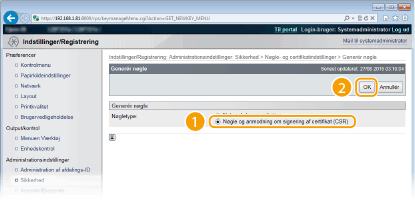 Vælg [Nøgle og anmodning om signering af certifikat (CSR)], og klik på [OK].