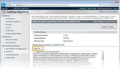 Du kan ikke bruge det nøglepar, der er genereret af CSR (Certificate Signing Request), før certifikatet er registreret. Når en CA (certification authority) har udstedt det digitale certifikat, skal du registrere det ved hjælp af fremgangsmåden herunder.