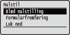 | Du kan annullere alle processer, slette data i hukommelsen og slukke for strømmen. Hvis du trykker på  (  ) på kontrolpanelet, vises menuen Nulstil. |