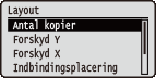 til 9999![]() | Indstillinger om udskrivningsudseende, herunder indbindingsmargen og udskrivningspositioner, vises med korte beskrivelser. Standardindstillingerne er angivet med en daggert ( ). |