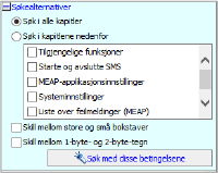 ![]() Søkealternativene kan brukes for å spesifisere hvilket kapittel du vil søke i, skille mellom store og små bokstaver, og hvorvidt det skal skilles mellom tegn med en og to byte.