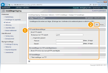 Merk av i avkrysningsboksen for å tillate innstillingsendringer for maskinen via FTP-klient. Fjern merket i boksen når du ikke vil tillate innstillingsendringer.